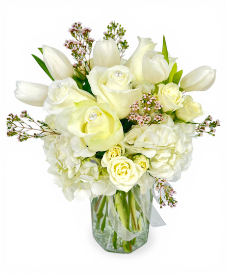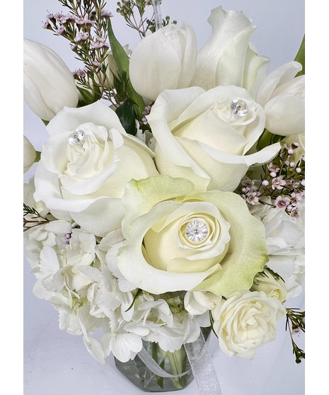 These beautiful shades of white are the perfect way to celebrate your April person! Inspired by the April birthstone, this diamond arrangement is full of white hydrangea, diamond-studded roses, white tulips, and more! All arranged beautifully in our clear faceted vase and finished with a diamond ribbon. Perfect to celebrate an April birthday or anniversary, send get well wishes, or just because! Share April Diamond today.