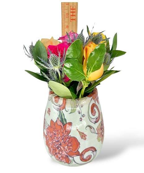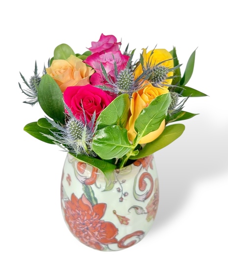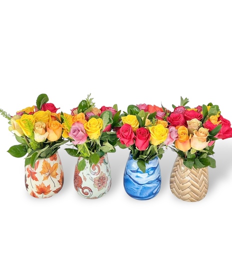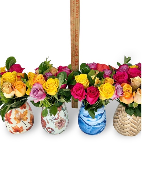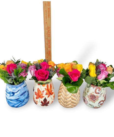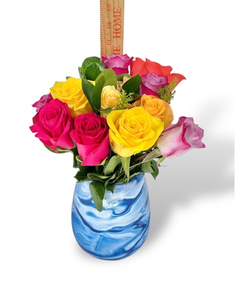 Looking for a bargain? Our Bargain Bloom Roses are just the thing for our friends on a tight budget! Choose from either a half dozen or a full dozen mixed color roses, arranged in our anti-tip plastic vases. These arrangements are not customizable and will always vary by color and the design on the vase. Half dozen vase is approximately 9 inches tall and the full dozen is approximately 10 inches tall!