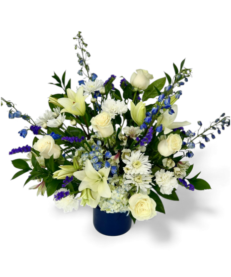 George's Beautiful Blues & Blanc is one of our most popular floral designs featuring our premium blue and white hand-picked flowers with blue accents in a blue glass vase suitable for any occasion. The Beautiful Blues & Blanc is approximately 24 inches and one-sided. Order the deluxe for a wider, more full arrangement! George's Flowers hand delivers Beautiful Blue and Blanc within the Roanoke, Salem, & Vinton areas!