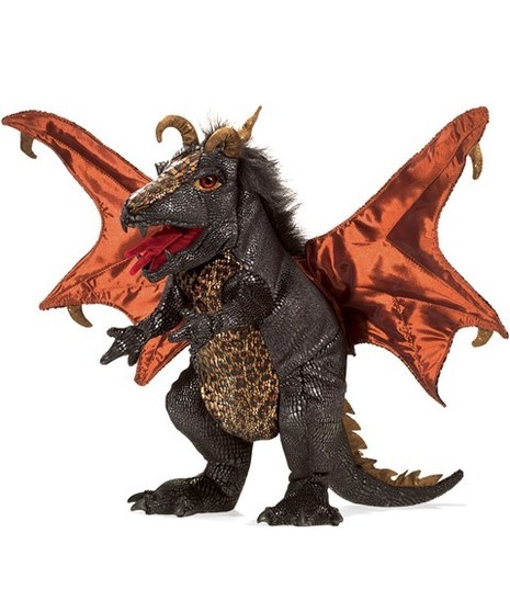 Rising up through the shadows emerges the formidable Folkmanis® Black Dragon puppet. Elaborately detailed with hypnotic eyes, serpentine skin and reptilian accents, this legendary creature comes to life with movement in the mouth, forked tongue and arms. Pull the cord at the base of the tail to expand an impressive wingspan and give flight to your fantastic imagination!