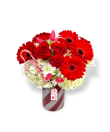 Hydrangea, roses, gerbera daisies, and more all swirled together with perfect peppermint, here is Candy Cane Lane! This bright red and white arrangement comes in a tall candy cane swirl vase.