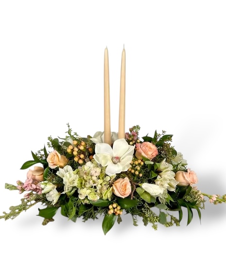 Bring in the holidays with a gorgeous seasonal centerpiece without the typical red and green color scheme! These soft peaches, pinks, and whites will brighten up an table and bring the cheer to Christmas breakfast, lunch, or dinner! Cocktail hour too!