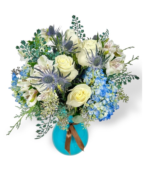 These beautiful shades of white, teal, and blue blooms are made up of white roses, blue hydrangea, blue thistle and more! Inspired by the December birthstone, share December Turquoise with your favorite December people!