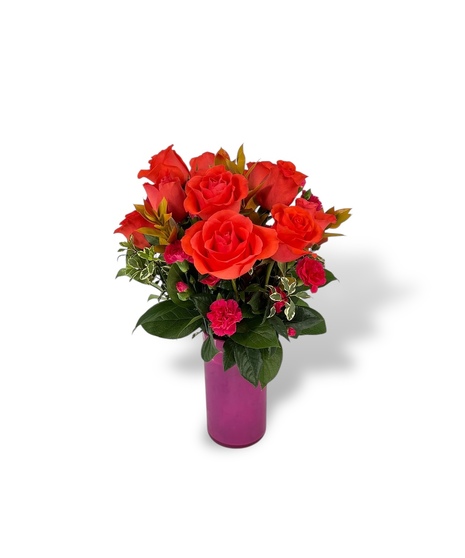 One dozen bright coral-orange dragon tale roses with hot pink carnations and greenery arranged in a bright hot pink glass cylinder vase. A great gift for someone who needs some brightness in their life!