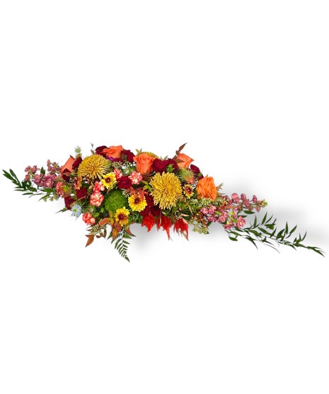 A beautiful seasonal centerpiece in the warm colors of autumn. Low and long, a conversation height, this arrangement would be perfect for the Thanksgiving table or for any fall occasion!
