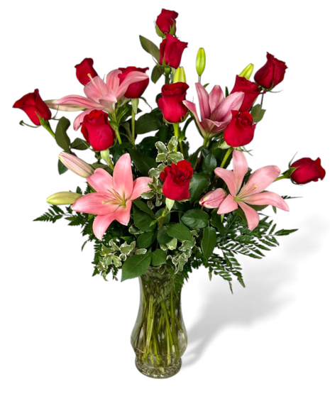 George's Dozen Red Premium Roses and Lilies a classic way to say "I love you!". George's hand delivers our beautiful Dozen Roses and Lilies in Roanoke, Salem, and Vinton Va. 12 Roses as shown, White or star gazer lilies, depending on availability.