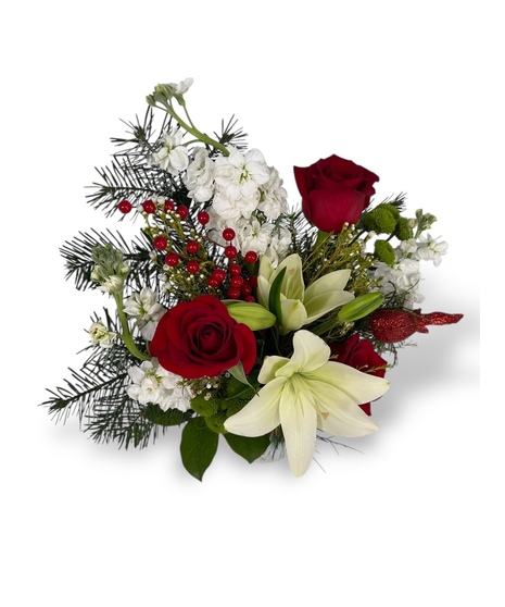 This holiday arrangement is full of beautiful white lilies, red roses, holiday greenery, and more! Arranged in a keepsake white mason jar, this is the perfect gift to give long lasting Holiday Memories.