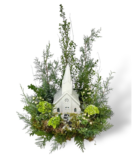 The wintery version of our Village Church arrangement- Inspired by Casey Jones Village Church in Jackson, TN, this gorgeous arrangement is a perfect combination gift with beautiful florals surrounding our ceramic music box church lamp! Yes, the church is a lamp and a music box that plays "Amazing Grace". A wonderful keepsake to have after the flowers are gone. This arrangement is larger than it looks, measuring approximately 26 inches tall and 18 inches wide, while the church itself is 12 inches tall and 6 inches wide.
