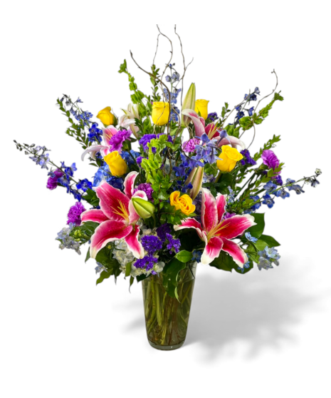 One of our largest and most impressive floral displays, this arrangement embodies the idea of go big or go home! Brimming with premium pastel blooms including lilies, roses, and delphinium, this piece is an instant stunner.Our George's Flowers Delivery Team will carefully transport this large piece to the recipient's home in Roanoke VA, Salem VA and Vinton VA