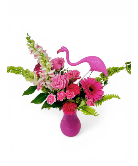 Pretty in pink and ready to party! This playful arrangement features pink roses, hot pink carnations, pink gerbera daisies, and a complementary mix of other premium blooms, topped with a fun plastic flamingo for the perfect pop of personality.
