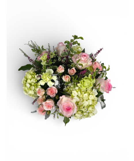 Send your sentiments with a Love Note this Valentine's Day with these pastel pink roses, green hydrangea, and more.