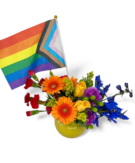 Shout it from the rooftops and Love Out Loud and celebrate Pride and all year long! Gorgeous bright rainbow color fresh florals are arranged in our adorable bubble vase! Whether you're an ally or part of the community, it's always great to show your support. George's Flowers is locally LGBTQ owned and operated.