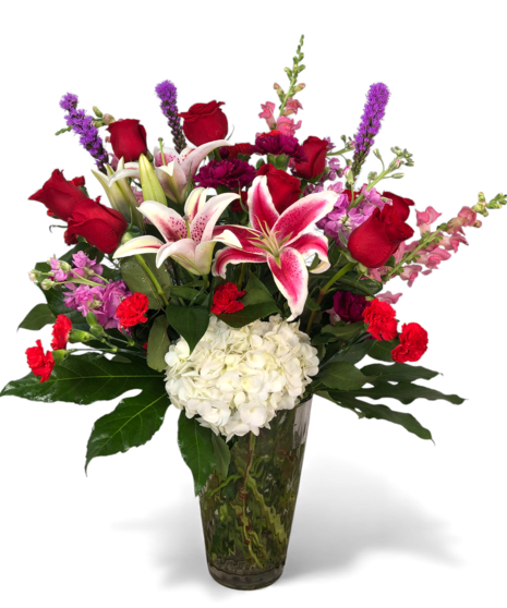 "Maybe I\'m amazed at the way you love me all the time!" Send your love something amazing this year with Maybe I\'m Amazed!Our large, red ribbed vase is chock full of gorgeous flowers that really say, "I love you!"Arrangement measure about two feet tall, a large statement piece.