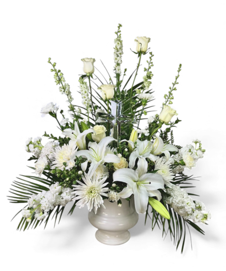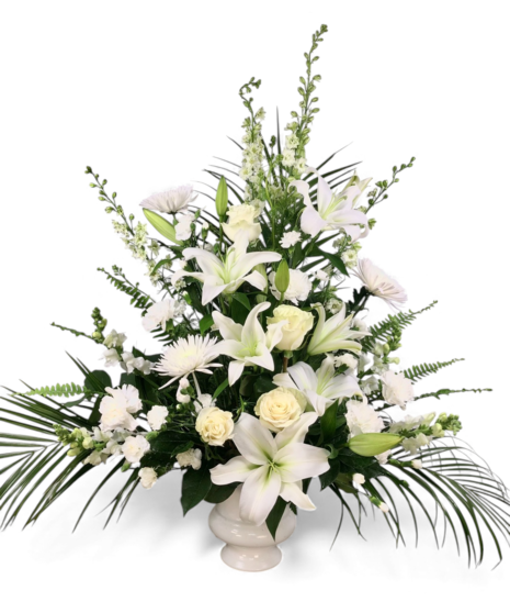 Roanoke Florist Peaceful White Lilies By George's Flowers One of our most requested sympathy tributes. You can trust George's Flowers for same day delivery to all local Roanoke, Salem and Vinton funeral homes and Churches. Whether you send this beautiful arrangement to the family home or to the service, all will appreciate its elegance and grace. The contrast of brilliant white blossoms and dazzling greenery create a wonderfully calm and dignified setting. Standard size is Approximately 29" W x 33" H ***Color of container may vary!***