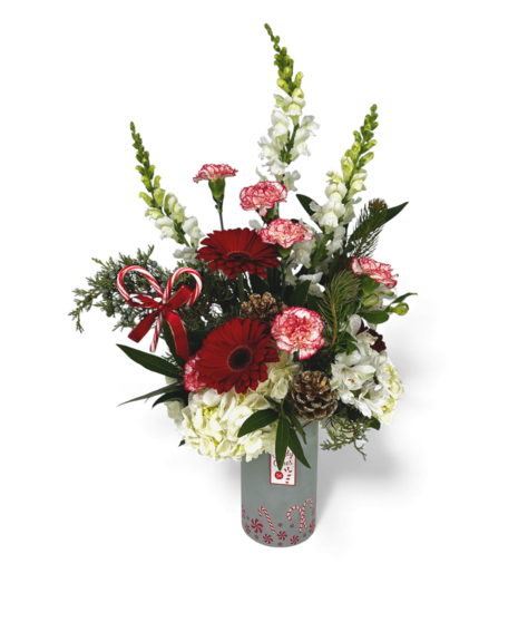 Gerbera daisies, roses, peppermint carnations, candy canes and more all swirled together, introducing Peppermint Dreams! This warm red and white arrangement comes in a tall grey candy cane detailed vase. The perfect way to celebrate the season!