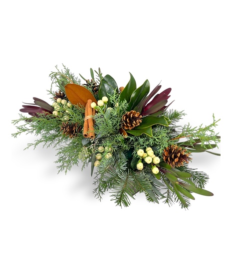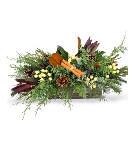 A warm and aromatic seasonal centerpiece set in a scented wooden box. Filled with fresh winter greenery, pine, and cinnamon. This arrangement is low and long, conversation height, and would make a beautiful addition to any holiday table.