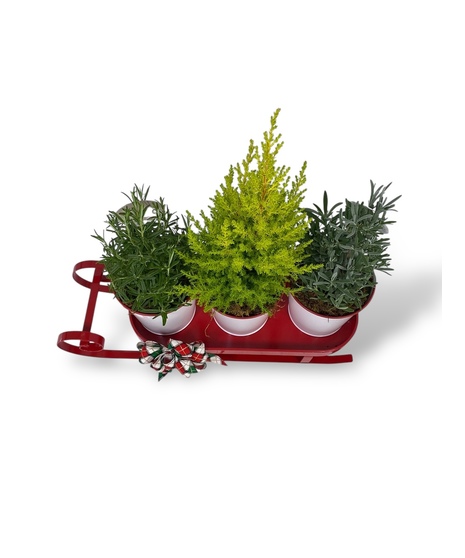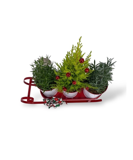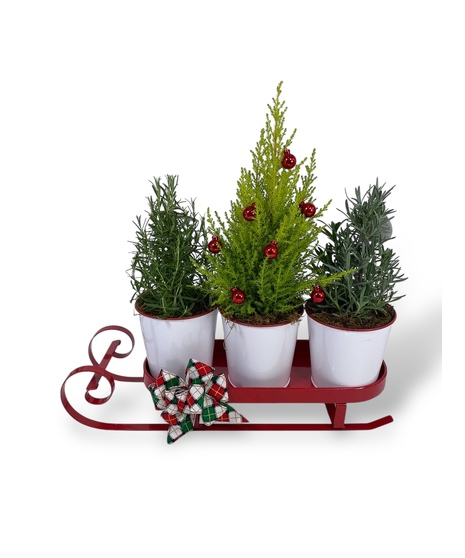 This beautiful grouping of live miniature trees includes rosemary, lavender, and lemon cypress. Available in white and red enameled pots on a keepsake sturdy red metal sleigh with built-in tray. Can be ordered with ornaments to adorn the tree.