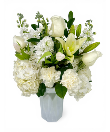 Soft, serene, and effortlessly elegant, Spring's Gentle Grace is a timeless all-white arrangement designed to bring a sense of calm beauty to any space. This lush design features white hydrangea, white roses, white tulips, white carnations, and a graceful white lily, artfully arranged for a full, cloud-like look.