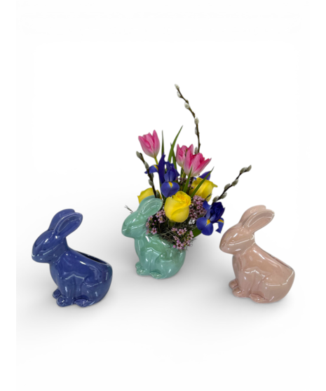 Get happy with our Springtime Hare! Choose from one of three pearlescent ceramic bunny pots and we will fill it with tulips, iris, and more spring accents for a truly adorable gift. Two gifts in one, the ceramic bunny can be kept to enjoy for years to come! Comes in pink, mint, and purple- Vase color will vary. For a specific color, please call us at (540)981-0900.