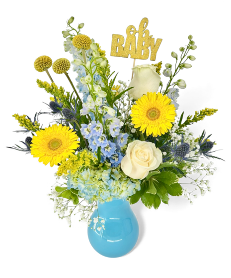 Welcome that Sweet Boy into the world! Soft blue and yellow florals arranged in our light blue glass vase is complimented with our sparkly Oh Baby pick to finish the look. A perfect gift for the parents of that new baby boy!