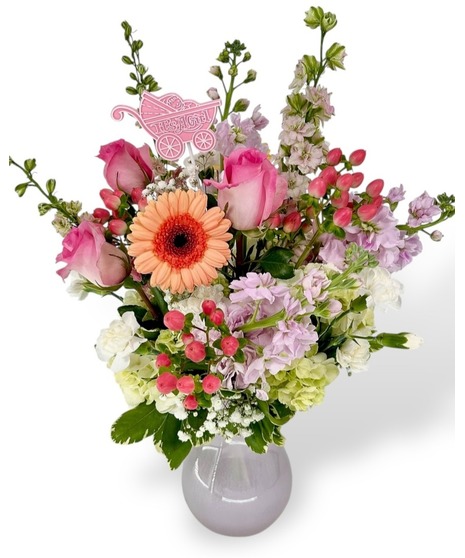 Welcome that Sweet Girl into the world! Soft pink and white florals arranged in our light pink glass vase is complimented with our new baby girl pick to finish the look. A perfect gift for the parents of that new baby girl!
