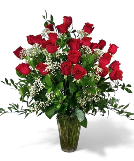 Two dozen premium red Roses with Babies Breath and assorted greenery in a lovely cut glass vase. Designed all around, approximately 33" tall.