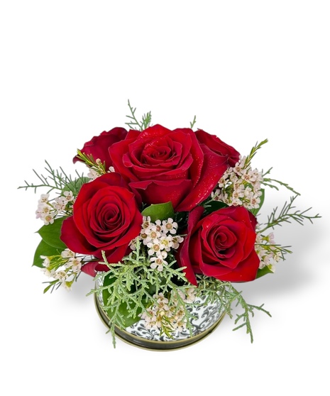 Welcome winter into your home with beautiful, romantic roses arranged in our black and white damask tins. The tins make great decor for your home to use afterward! Choose from 5 roses or 10 roses accented with wax flower and evergreen.