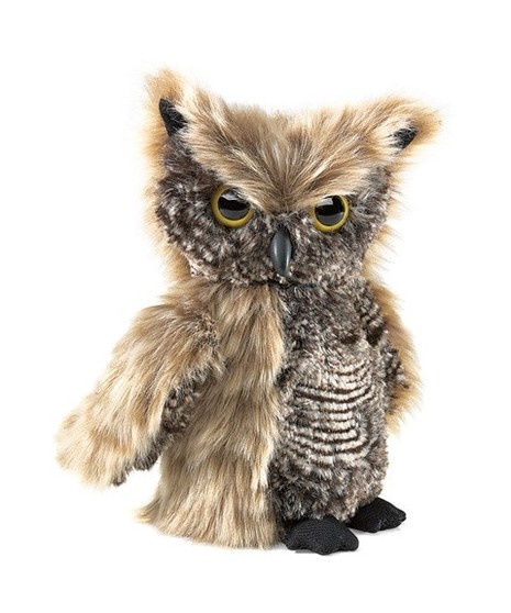 Feathery tan and grey plush mimic the soft, silent feathers of the SCREECH OWL puppet so realistically that they almost camouflage this woodland creature. With the hidden rod, turn his head to fix his watchful eyes on you! Length:3" Long Width:3" Wide Height:6" Tall Weight:1.6 oz.