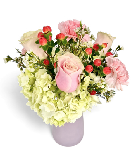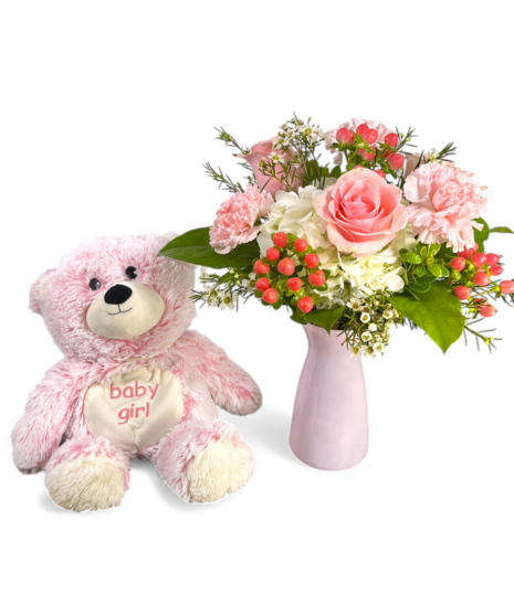 Welcome the new baby girl to the family with our Baby Girl Bundle! Pink and white in a bright pink vase are accompanied by our adorable pink baby girl Warmies bear when you choose the bundle option! Warmies are plush toys that can be heated in the microwave to provide gentle heat for many uses- Please use caution when heating for small children and babies, follow instructions on the tags!