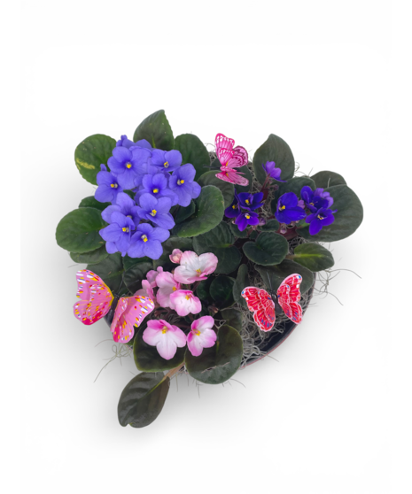 African Violets look great in any room of the house, but make sure it doesn't get any intense sunlight as African Violets are sensitive to harsh light. This plant prefers early morning light and filtered afternoon light, so keep that in mind when you are choosing where to place it. It is recommended to water from the bottom. This planter is three plants in growers pot, nestled together with butterfly accents! Container for the African Violets may vary. These plants are rated a 2 on our care scale, pretty easy! Approx. 15in tall and 10in wide.