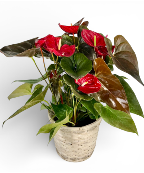 A beautiful blooming tropical anthurium plant, in its grower's pot and a beautiful embossed metal pot cover. Large at 8 inches in diameter for the pot. Care is minimal, but we rate the care as a 3 on our scale of 1-5. Bright, indirect light is best and the soil should remain moist, not wet and not bone dry ever. Bloom color may vary.