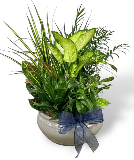 Our dish garden planters include an assortment of easy to care for tropical green plants, ensuring you'll get years of enjoyment out of your garden. The photo is an example - all dish gardens are unique, as container styles, plants included, and bow colors will vary based on availability. If you have custom requests for your garden, please call the shop directly to work with a salesperson. Rated a 1 on our care scale, super easy! Requires medium to bright light and low water. With no drainage, all of the water added will stay. Overwatering will cause rot!