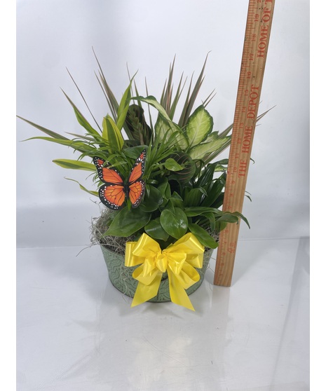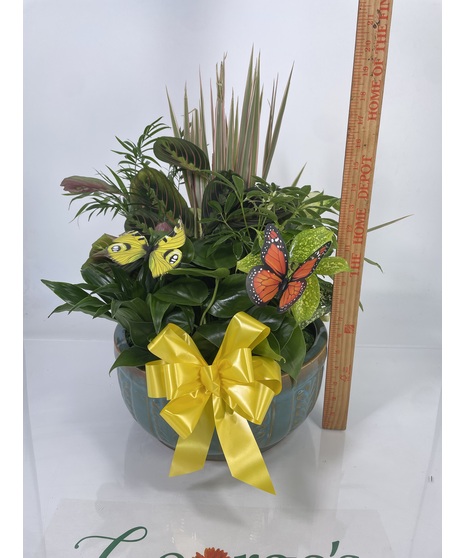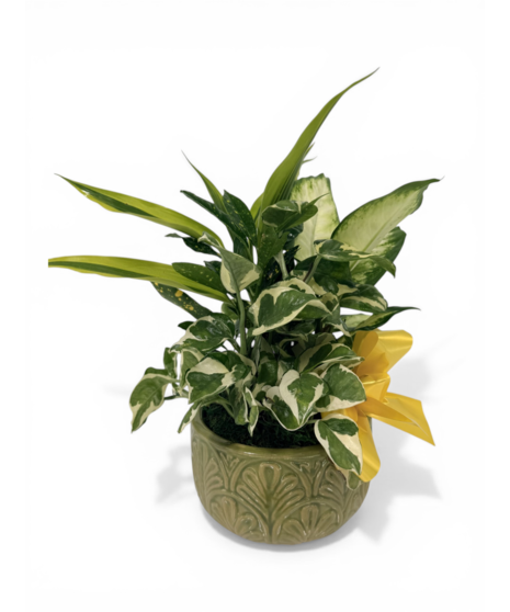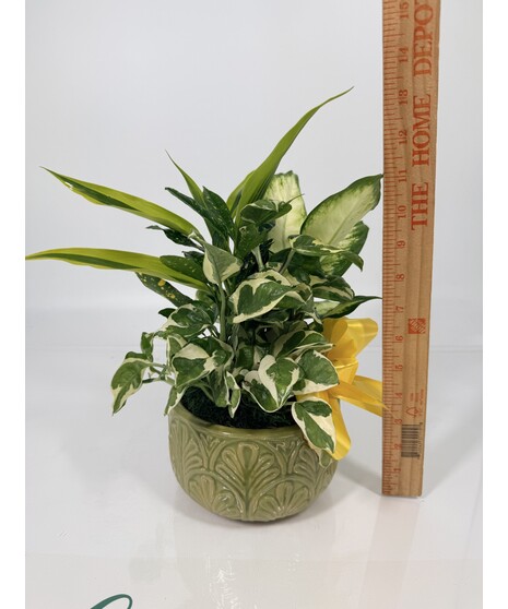 Our dish garden planters include an assortment of easy to care for tropical green plants, ensuring you'll get years of enjoyment out of your garden. The photo is an example - all dish gardens are unique, as container styles, plants included, and bow colors will vary based on availability. Rated a 1 on our care scale, super easy! Requires medium to bright light and low water. With no drainage, all of the water added will stay. Overwatering will cause rot.