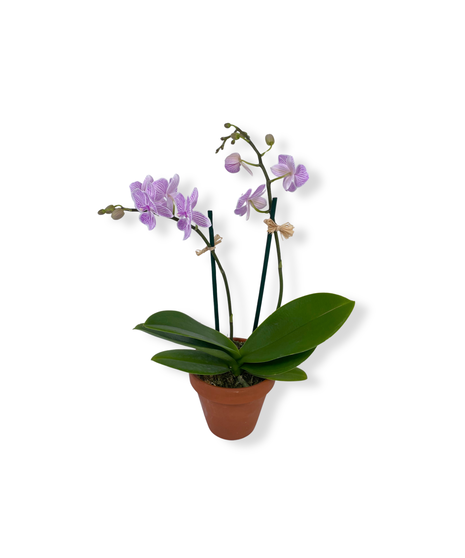 Our mini orchid is a mini show stopper in its own terracotta container! Each plant measures approximately 14 inches tall and rates a 3 on our care scale. Intermediate plant experience helps! Mini orchids are a bit easier to get to rebloom than the larger varieties. Water sparingly about once a week, keep out of the direct sun and out of high heat. Medium-light and a cooler environment are preferred. Care instructions included with purchase.