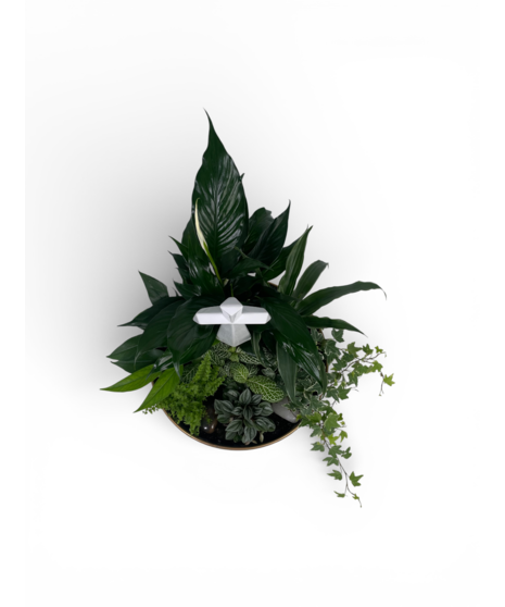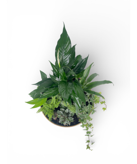 Our elegant dish gardens planted up in house with a variety of green easy care plants! No drainage, these gardens will require bright indirect indoor light and care will need to be taken not to overwater! Rated a 2 on our care scale out of 5! Approx. 16in tall and 13in wide.